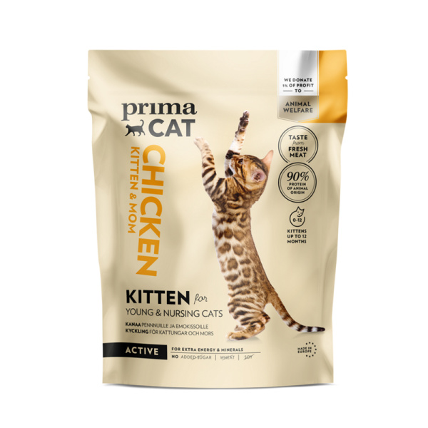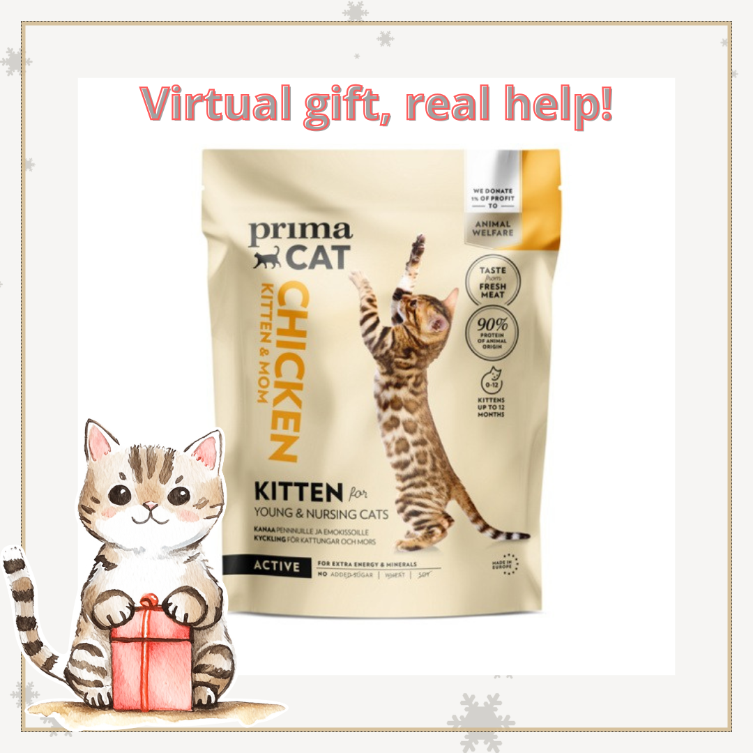 PrimaCat Kitten Chicken dry food is a great feed for growing kittens — your gift to shelter cat babies will give energy, nutrients and comfort to cats waiting for their forever homes. Choose from 3-pack or 6-pack options to provide the best value for your donation. A lovely way to help shelter kittens grow strong.